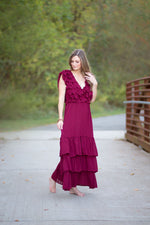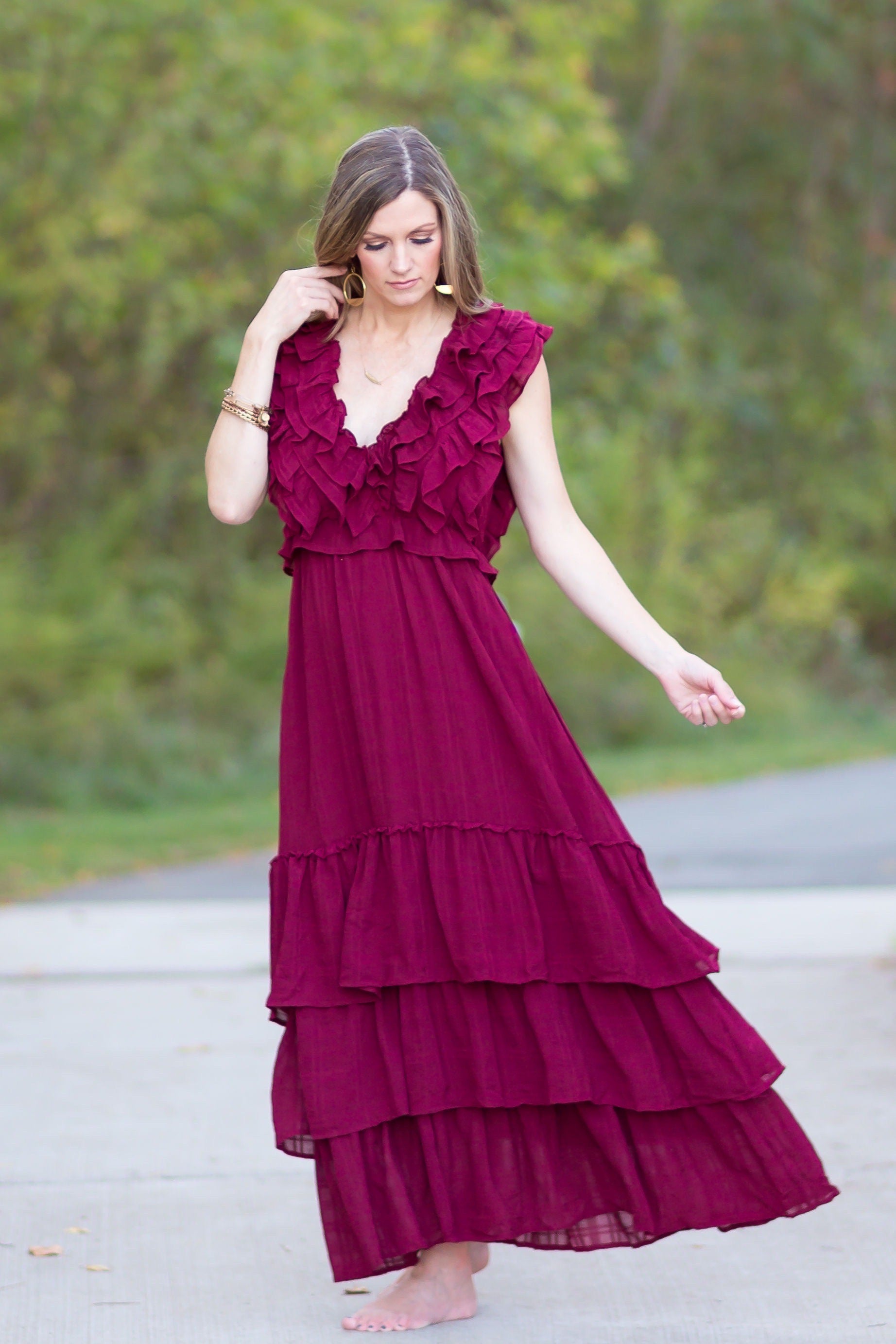 The most beautiful dress for Fall weddings, family photos and more! Our Define The Moment Wine Maxi Dress features a v-neckline, ruffle detail, an elastic waistband, a flowy tiered skirt, and an open v back with neck tie closure.