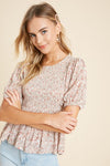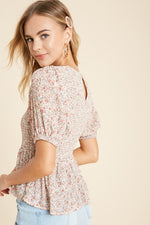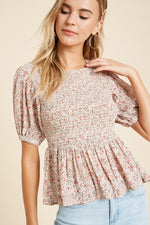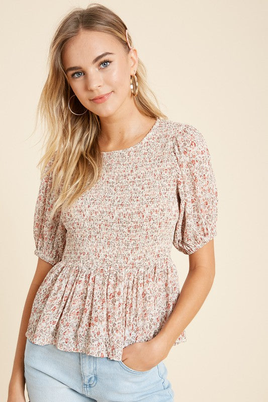 This adorable ivory floral print smocked peplum top features a round neckline, puffed short sleeves, and a flounced hem.