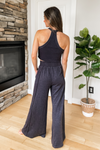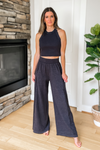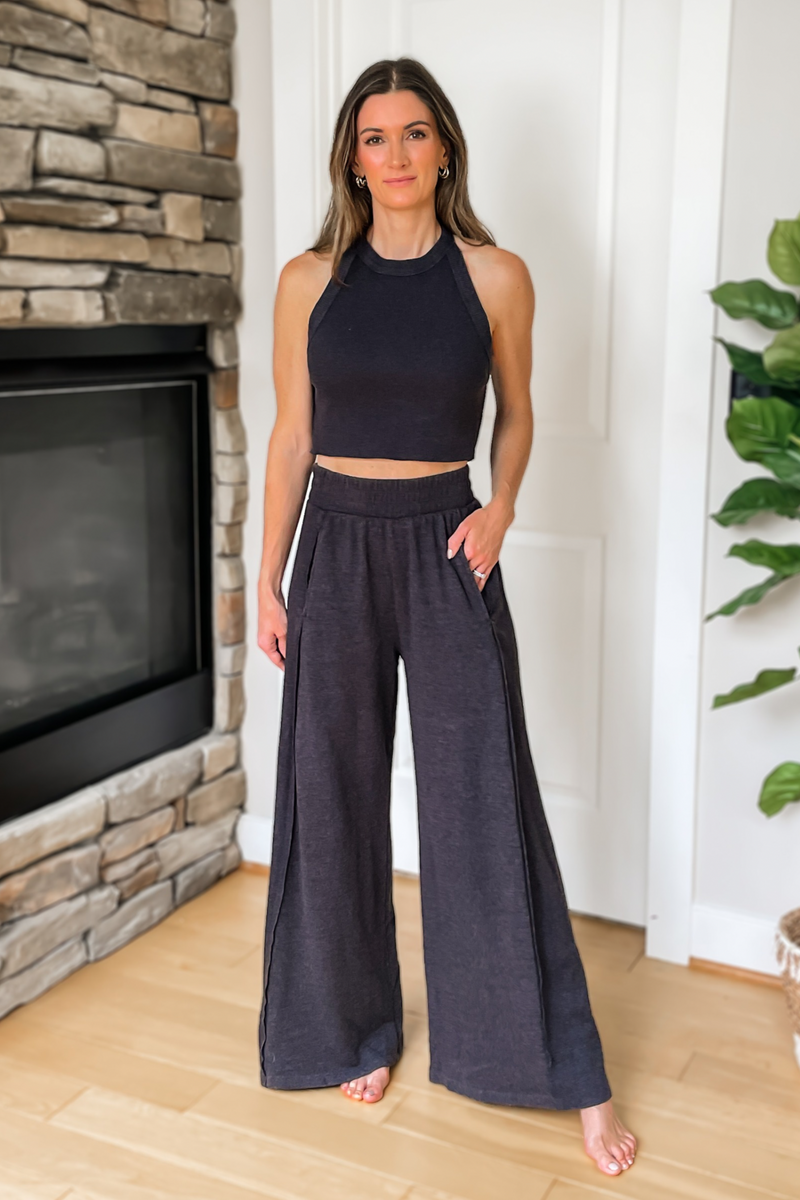 This comfy lounge set is perfect to throw on and go! Our On The Go Lounge Set in Charcoal features a halter neckline, sleeveless tank, cropped length, with matching wide leg lounge pants with pockets, and an elastic waist in a mineral wash fabric.