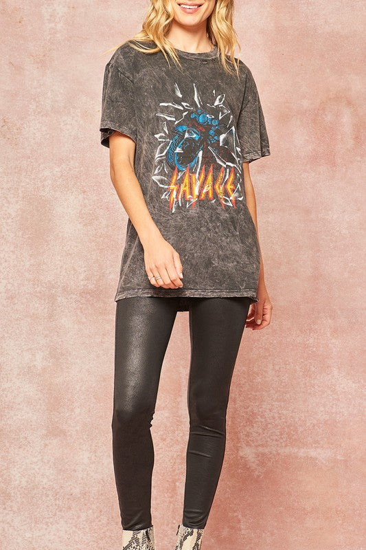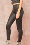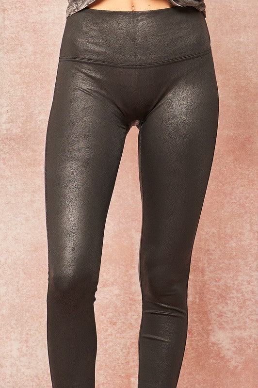 These black faux leather leggings feature a textured leather look with a wide waist band and stretch fabric.