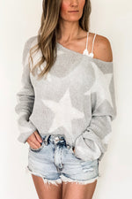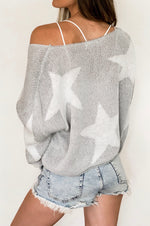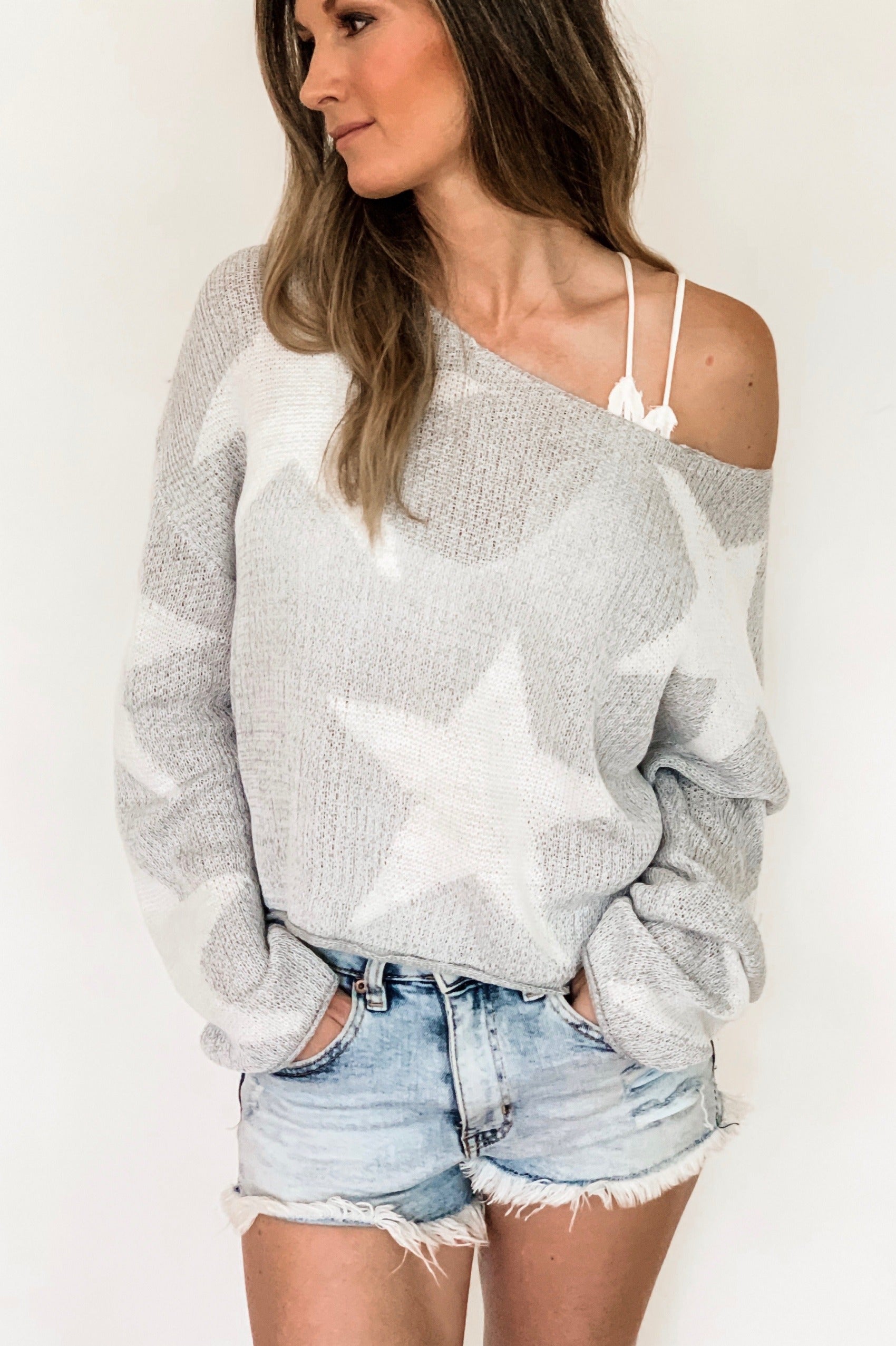This heather grey cropped knit sweater features a relaxed fit, round neckline, and ivory stars throughout.